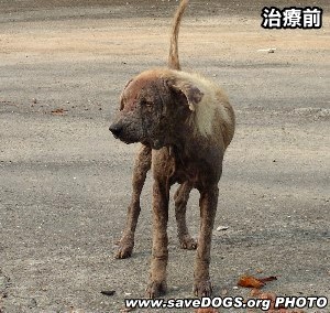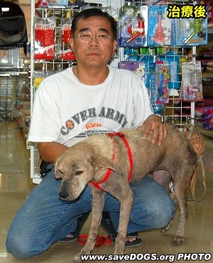 一日,有個好心的人類竟拿著香噴噴的雞腿餵我吃,但我怕靠近他又會被打被踢,於是都不敢接近他,漸漸的,我發現他常常會餵我吃好吃的東西,忍受不了飢餓我決定再相信一次人類,悄悄的接近這位看起來很善良的先生,沒想到他不但不在乎我的惡臭,還帶著關愛的眼神摸摸我,有多久沒有被人類碰觸的我,卻感受到前所未有的幸福,雖然身上的皮膚還是好癢,但我卻在此刻忘卻了所有的難過和痛苦,大口大口的吃著雞腿,一邊被溫柔的拍拍頭,我知道我皮膚的病有了轉機,我終於可以看醫生了,真的好希望能好好的睡一覺,謝謝你們!真的謝謝你們願意給我一個重新生活的機會,我開心的不停搖著尾巴,也許老天聽見我每天悲傷的哀嚎,也許我終於遇到了生命中的天使了,而我的新人生也即將展開!